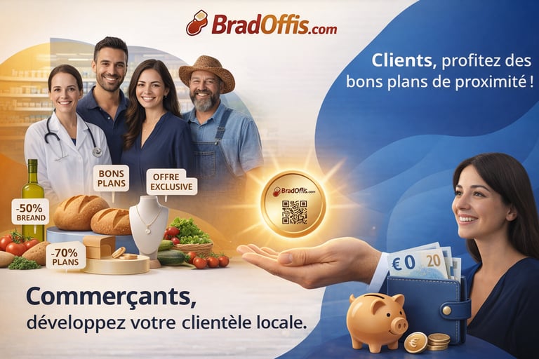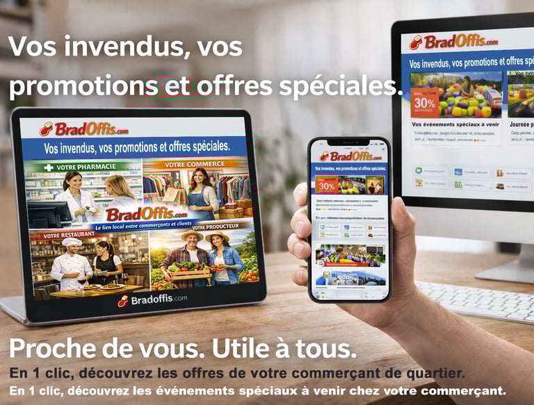 Commerçants et clients, accédez à bradoffis.com pour gérer facilement votre visibilité et achats en ligne.